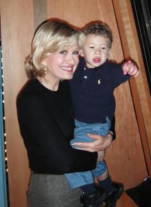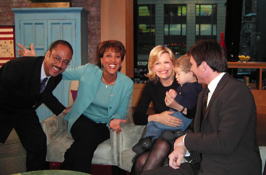 This is me with Diane Sawyer, host of ABC's Good Morning America. After we were on the show, she was nice enough to pick me up and show me what was outside in Times Square. It was very cool to see all of the lights and cars and buses. I even saw a "Goldfish" truck. I love to eat goldfish! My daddy was ready to go on for Diane, but she eventually put me down...though not before I gave her a big kiss! |