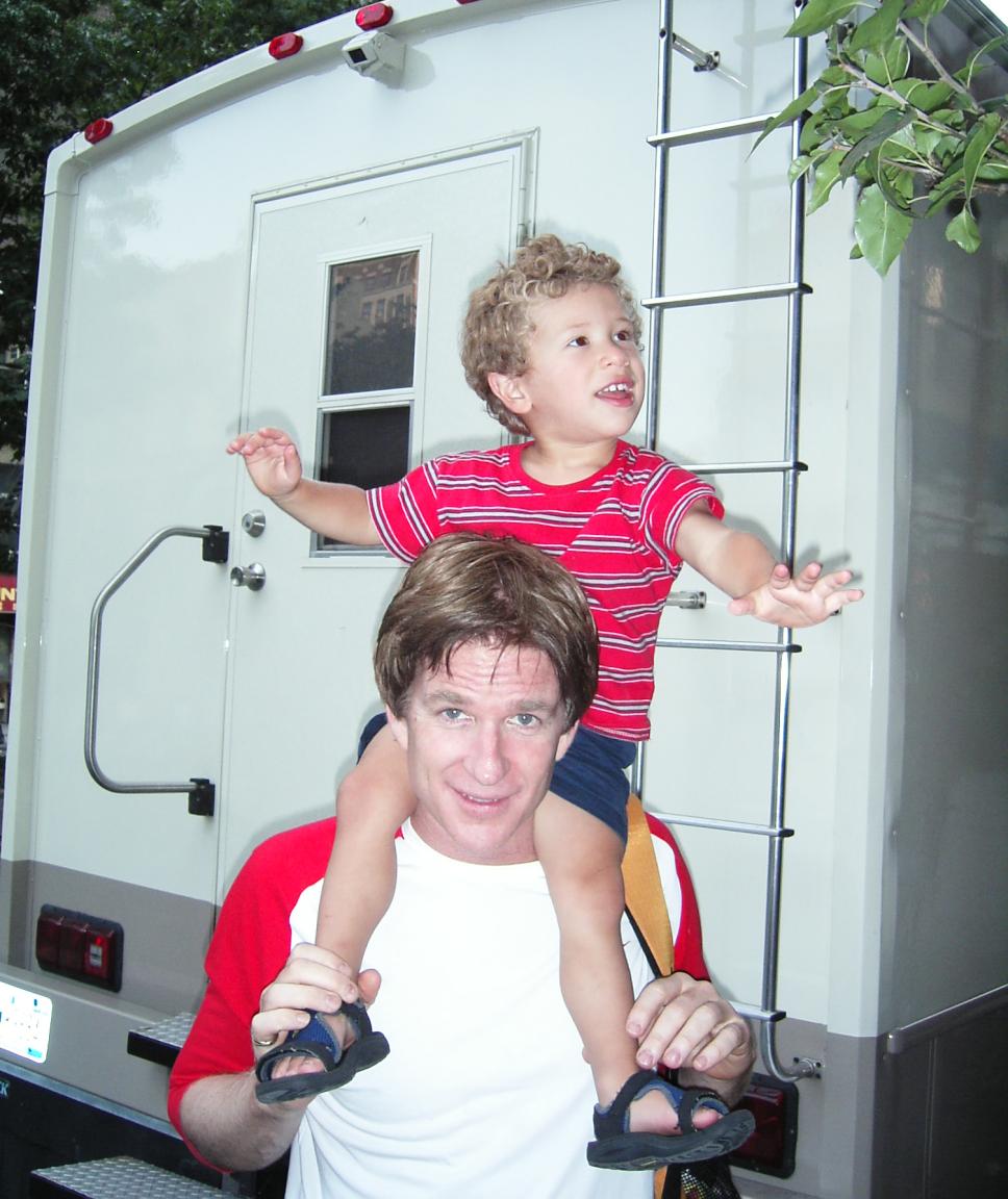 Well, you really don't know who you will see on the streets of New York! Daddy and I were walking down Broadway when we saw a film crew from a movie called "Kettle of Fish." It turns out the star is Matthew Modine who starred in the movie Private School with my dad! Matthew was very happy to see my daddy and they talked for a while. Daddy asked Matthew if he would pose with me and Matthew picked me up and put me on his shoulders for a picture. I thought he was just getting me closer to the tree so I could grab it! |