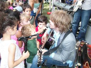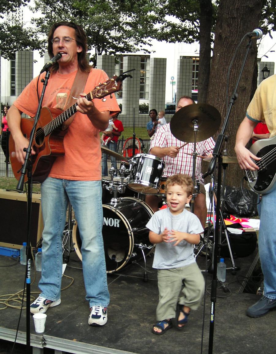 This is me with Ulysses S. Dee of the group, The Deedle Deedle Dees. They were performing at Madison Square Park as part of the park's 2005 Kids Performances. They played for about an hour and I danced most of the time and it was really, really hot! After one of the songs, Ulysses asked a question and I answered right and he gave me a copy of the groups debut CD, Let It Dee. |