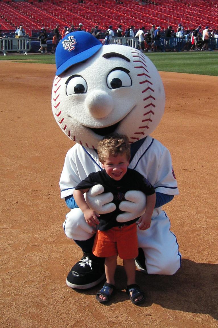 My mommy and daddy and I went to Shea Stadium to see The New York Mets play the Washington Nationals. It was my first Mets game and I got my picture on the scoreboard in my brand new Mets t-shirt. Sadly, the Mets lost, but I had a lot of fun. After the game all the kids who wanted to lined up outside the centerfield fence and we were led in and allowed to run the bases! Daddy went with me around the bases and took this photo of me with Mr. Met between second and third base! It was very excitin and the stadium looks very, very big when you are on the field. So, now I have been to a Yankees game and a Mets game. I am getting to be a real New York sports fan! |