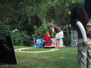 This is Bailey, one of the other kids in the commercial. He was a lot of fun to play with and he worked really, really hard! His mom is the lady in the white shirt and brown skirt next to the tracks in the pictures above. |
