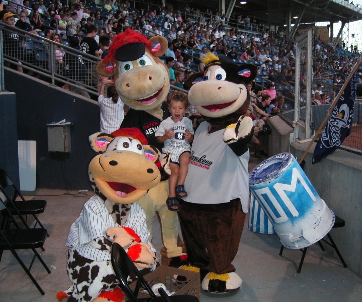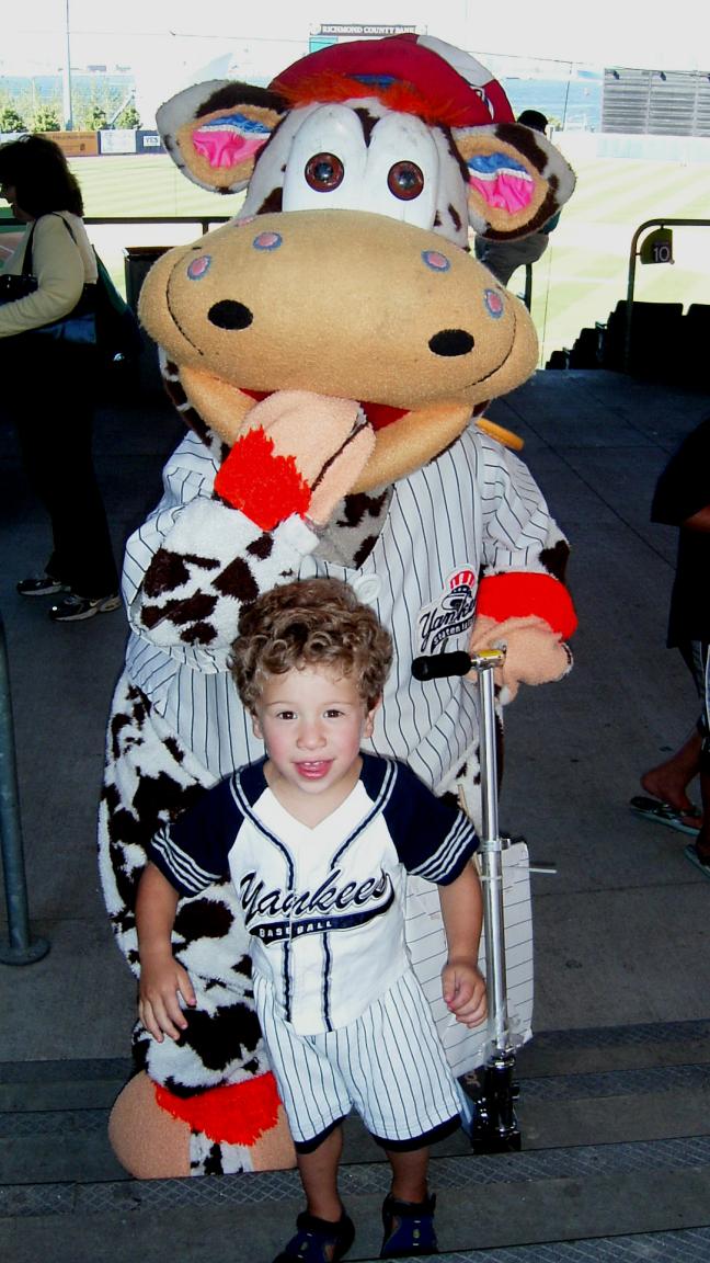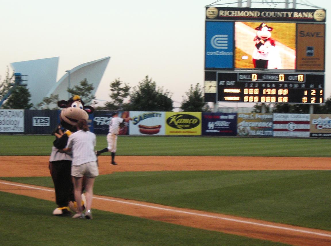 When we entered The Richmond County Ballpark at St. George to see The Staten Island Yankees, we were greeted by Scooter, the Holy Cow, one of the mascots of the team. We had some hot dogs and soda (a treat for me) and went to the stands. |