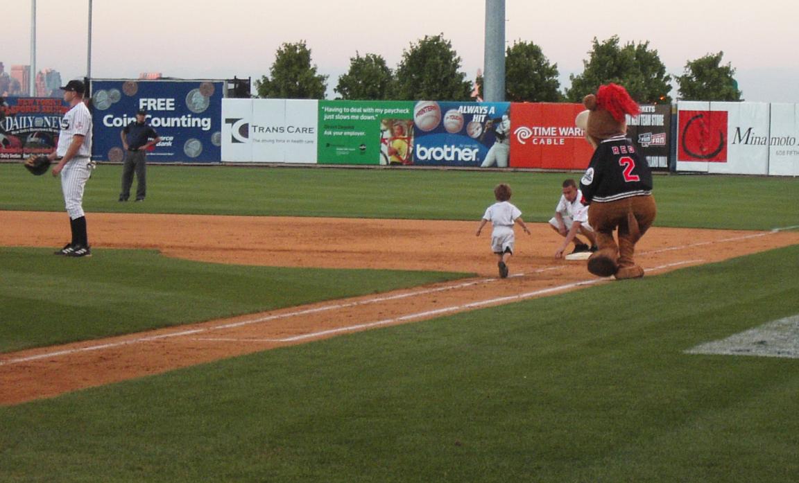 As I rounded third base, I got scooped up by Huck, the third mascot for the Yanks. You can even see me up on the scoreboard! Huck and Kristen, who works for the Yanks, carried me back to home plate where my dad was waiting. |
